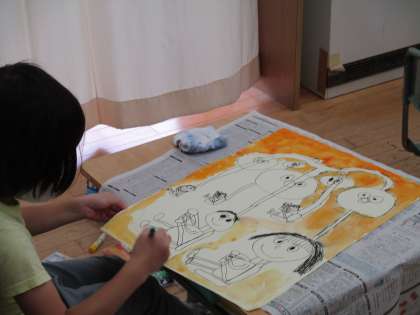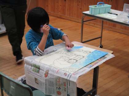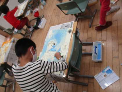 図画工作科の学習で、生活の中で心に残っていることを絵に表しています。水彩絵の具での色づけでは、筆だけでなく、スポンジを使っての彩色にも挑戦しました。