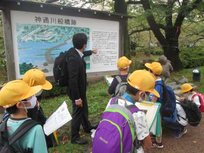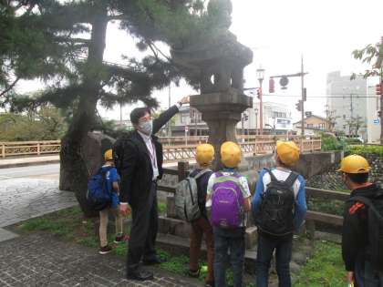 郷土博物館で郷土の歴史にふれたあと、江戸時代に神通川にかけられていた船橋の遺構を巡るフィールドワークを行いました。校長先生にガイダンスしていただき、今も残る常夜灯の様子や松川ぞいに連なる鱒の寿し屋さんの立地などから、当時の様子に思いを巡らせていました。
