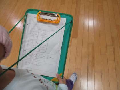 算数の学習で、校内にあるもので、かけ算の式にあらわせる場面を探しました。掲示物や窓などいろいろなものを見つけ、式に表しました。