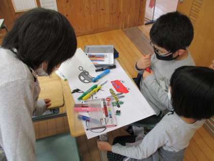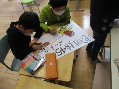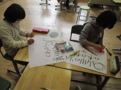 学習発表会で使う小物やクイズで使用するボード作りをしました。学習したことを分かりやすく発表するために文字だけでなく絵も描きました。