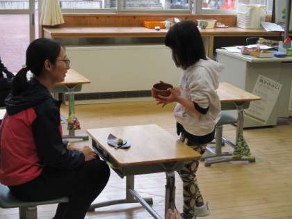 生活科の学習で、先生方に日頃の感謝の気持ちを伝えるためにお茶会を行いました。お茶を点てて、手作りのお菓子を運び、お茶を運びました。
