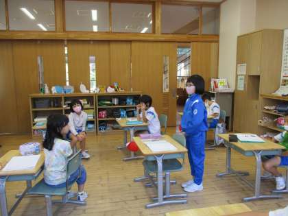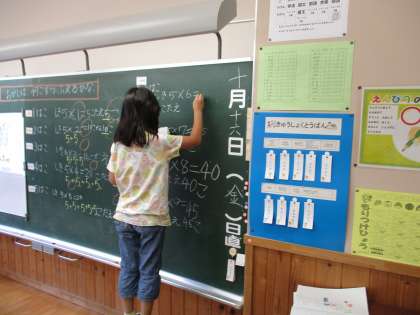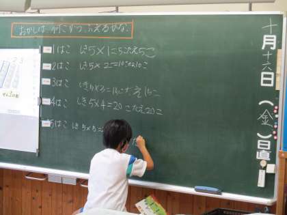 算数の学習で、1箱におかしが5個ずつ入っている箱が何箱かある問題を考えました。箱が9箱あるときまで1つずつかけざんの式を考え、お菓子の数を求めました。すると、1箱増えるとおかしが5個増えることに気付き、箱が10箱、11箱、12箱と増えてもお菓子の数を求めることができました。