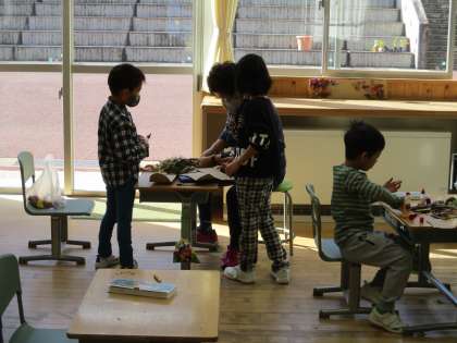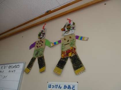先週から葉っぱや花でかざったりクレヨンで色をつけたりしてつくっていたおめんやからだが完成してきました。段ボールを切り取ったり、折ったりして手や足を表しました。