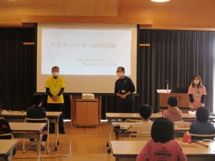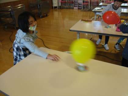 サイエンスカーが来校し、ホバークラフト体験を行いました。ホバークラフトの原理を学んだ後、工作と体験に分かれて活動しました。ふうせんやCD等を使ってホバークラフトを製作し、走らせてみました。その後、実際にホバークラフトに乗って体験しました。