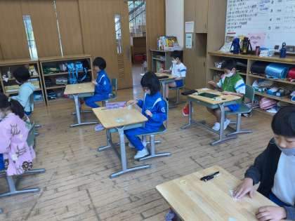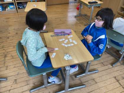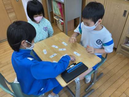 算数の学習で、九九を覚えるために、先生が言った式の答えが書いてあるカードをかるたのように探して取りました。できるようになってきた子供は、友達同士で対戦し、楽しみながら九九を覚えました。