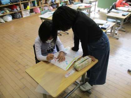 算数の学習で、円と球の仕上げの問題に取り組みました。早くできた子供が、つまづいている友達に優しく教えていました。