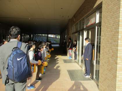 5、6年生合同で、氷見・高岡・新湊方面へ校外学習に行ってきます。出発のあいさつをし、バスに乗り込みました。1年生が見送りに来てくれました。