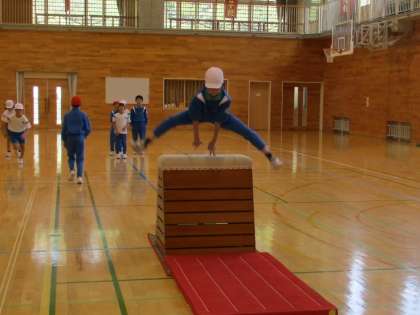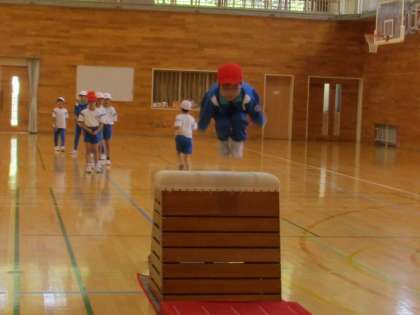 体育の時間に、跳び箱運動に取り組んでいます。開脚跳びや抱え込み跳びの練習をしました。