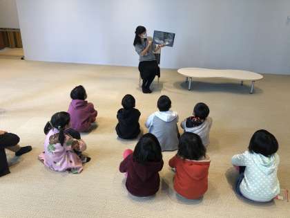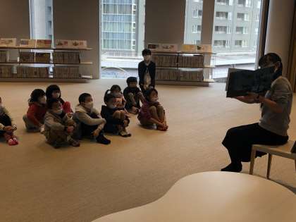 富山市立図書館で、所員の方から読み聞かせをしていただきました。子供たちは、どの話も興味津々です。