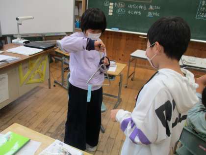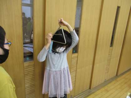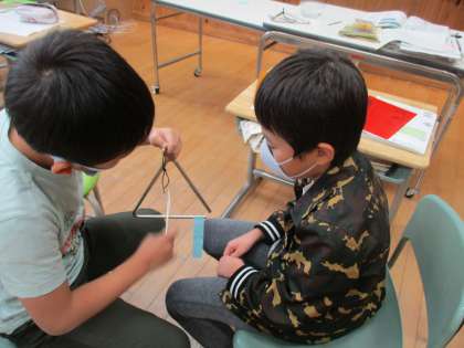 理科の学習で、音が出ているとき、楽器はふるえていることを発見しました。今度は、音の大きさによってふるえ方が変わるのか実験して調べました。トライアングルにつけた付箋のふるえ方を見たり、さわったりしました。目と耳を使ってよく観察していたので、付箋からビリビリと音がすることも発見しました。