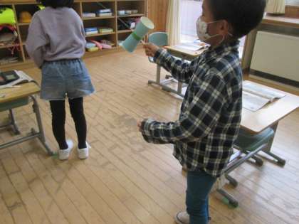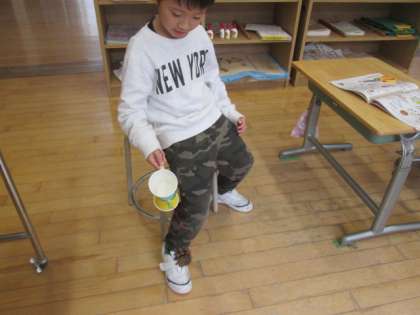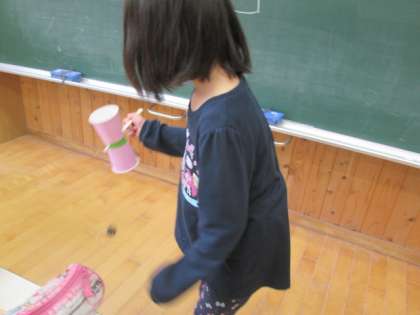 生活科「見つけたあきであそぼう」の学習で、まつぼっくりのけん玉作りをしました。まつぼっくりの大きさや糸の長さはそれぞれですが、自分のやり方で上手に入れて楽しんでいます。