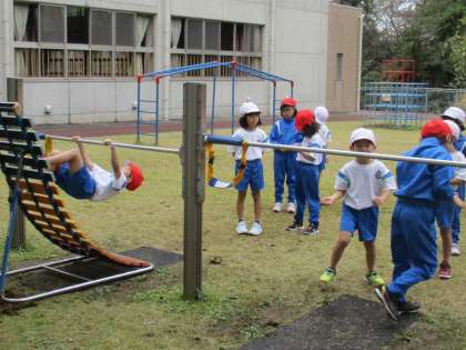 体育の時間に、てつぼう遊びに取り組んでいます。逆上がりに挑戦したり、てつぼうにぶら下がったりして楽しみました。