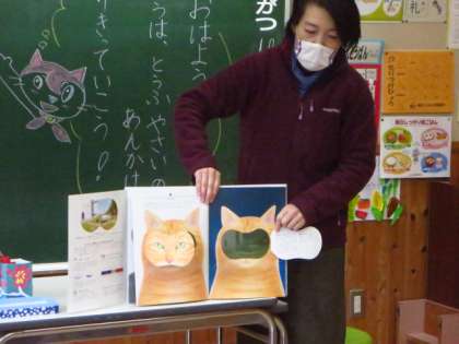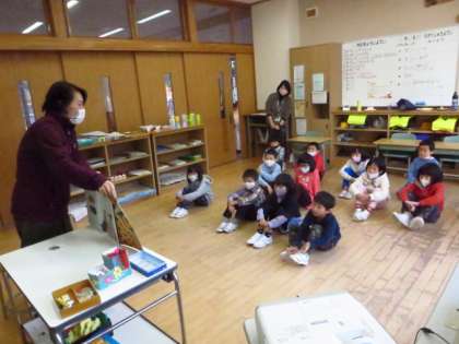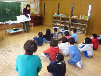 10日、ボランティアの方による低学年の読み聞かせがありました。この日は「動物のみている世界」という本を見せていただきました。動物の特徴や暮らし方によって、見えている色や範囲等が違うことが分かり、子供たちは大喜びでした。