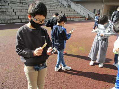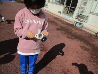 理科の学習で、虫眼鏡で日光を集めるとどうなるのか実験して調べました。日光を1つの点になるように集めるとみるみるうちに黒い紙が焦げました。
