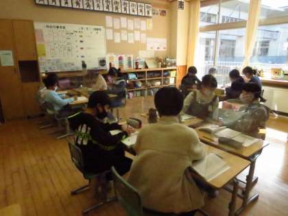 6年生の国語は、鳥獣戯画についての説明文を学習しています。鳥獣戯画の絵と説明文の関わりについて、グループで熱心に話合いをしました。