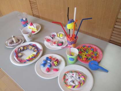 7日(土)の学習参観の折に、家族の方と一緒に作り始めた「ごちそうパーティ」ですが、いよいよ完成し、展示しました。「ニューヨークケーキが気に入っています」「ロールカステラがきれいです」「ミックスジュースに綿飴を付けました」「ヨーグルトにブルーベリーをのせました」等、楽しみながら作りました。