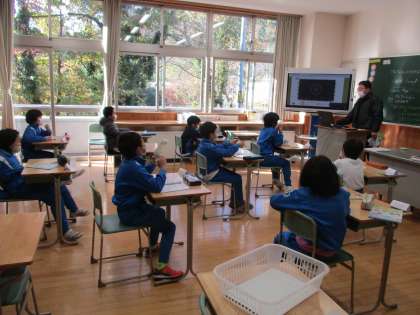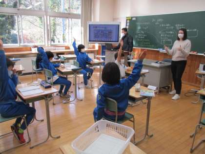 外国語科の学習で絵の中に書いてあるアルファベットの文字を探し、その文字を発音しました。また、ALTの後に続けて、英単語の発音もがんばりました。いろいろな英単語を見つけ、"toy shop"が"おもちゃ屋"のことだと知りました。