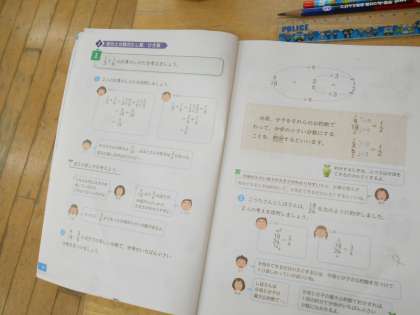 5年生は、分数のたし算の答えが約分できる場合の表し方について学習しました。同じ大きさの分数では、なるべく簡単な分かりやすい分数で表すことがよいと学びました。