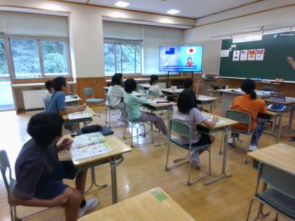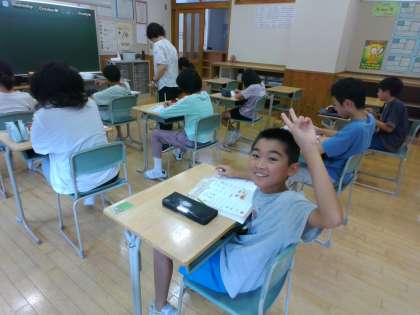 授業の初めは、いつも文字の音クイズから始まります。正解して喜んでいます。6年生は、英語の歌もいつもノリノリで歌います。