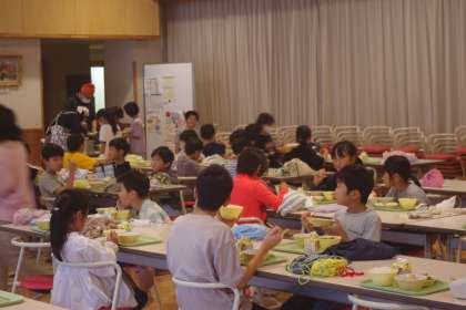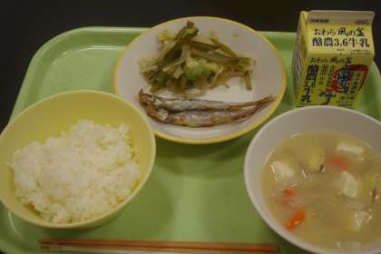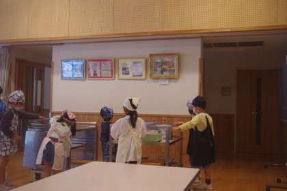 4年生が給食の準備をしている姿を見て、早く来た1年生が、自分たちのできることに取り組み始めました。互いに声をかけ合い、周りに気を付けながら準備する姿に感心しました。
