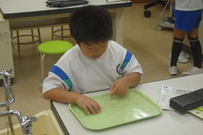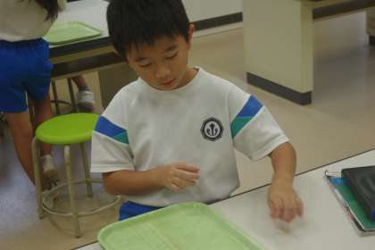 音がどのようにして出ているのかについて、楽器を叩いたり、伸ばしたゴムをはじいたりしながら確かめています。