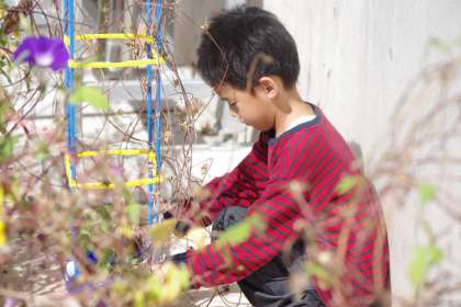 あさがおの種をとっています。たくさん集めて、嬉しそうです