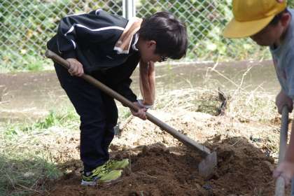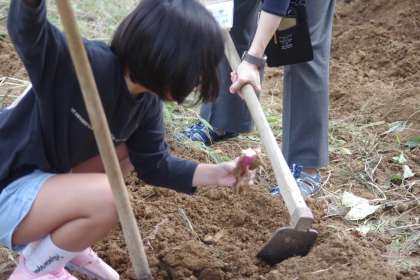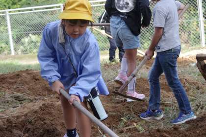 3年生が、大根を植えるための畝を作ろうとしたら、土の中からサツマイモが出てきました。畝づくりが、宝探しに変わりました。