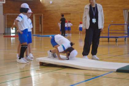 今日は、1,2年生と3,4年生に分かれて体育の学習を行いました。1,2年生は、いろいろな動きを、3,4年生はマット運動に取り組んでいます。