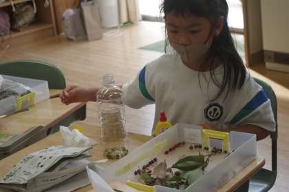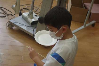 作ったおもちゃが、今以上におもしろいものになるように改良を加え始めました。友達のおもちゃも試しながら、工夫を考えているようです。