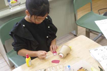 子供たちのおもちゃづくりが、どんどんパワーアップしています。ドングリまつぼっくり等の木の実に落ち葉、いろいろなものを持ってきて楽しみながら作っています。