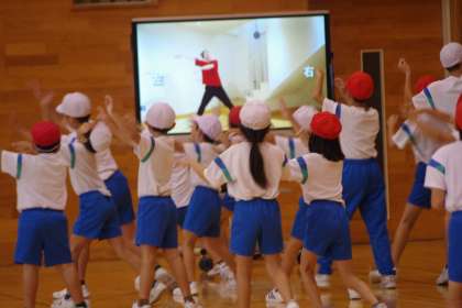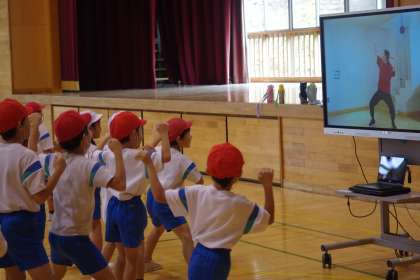 今日の朝の時間はチャレンジタイムです。いろいろな運動に取り組んでいます。まずは、ダンス。