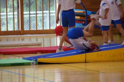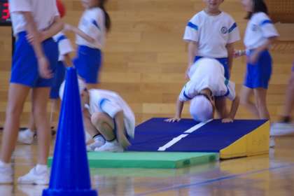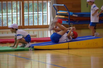 次は、マット運動。低学年の子供たちも、しっかり体を動かしています。