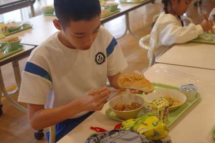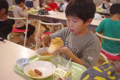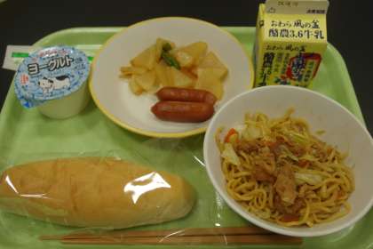 今日の献立にある「やきそば」は、子供たちに大人気。パンに乗せたり、はさんだりして食べていました。