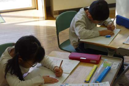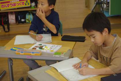 昨日の学習を手がかりにして、たしざんの計算の仕方を考えています。
