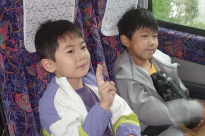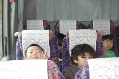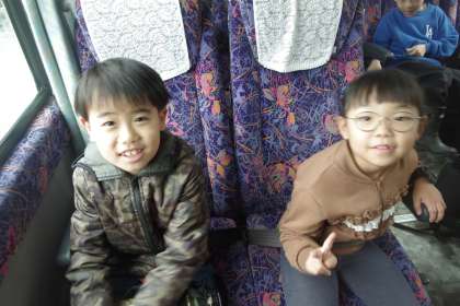 今日は、音川小学校の1,2年生のみんなと一緒に呉羽青少年自然の家に校外学習に出かけます。出発前から、みんなわくわくする気持ちでいっぱいです。いよいよバスが出発します。