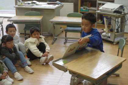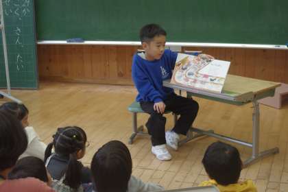 1年生の子供たちが、友達の読み聞かせを聞いています。