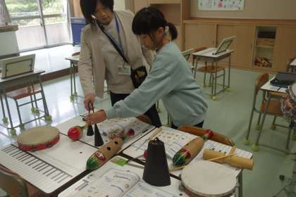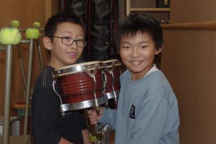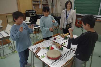 打楽器でリズムアンサンブルをつくります。今日は、いろいろな打楽器を出してきて、音を確かめました。