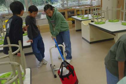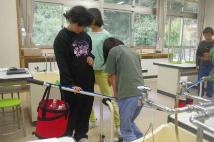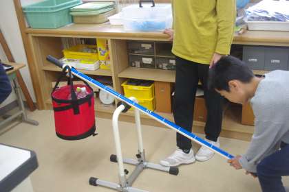 てこの働きについて学習しています。支点・力点・作用点を変えると、手に伝わる重さが変わることに驚いていました。