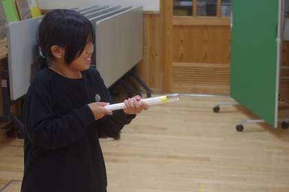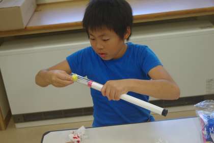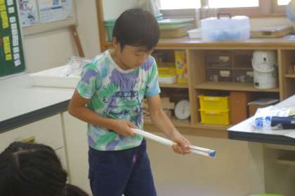 空気でっぽうの球が飛ぶときの筒の中の空気の様子について考えています。球が飛ぶまでの手応えを確かめたり、筒の中の様子を観察したりしています。