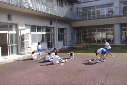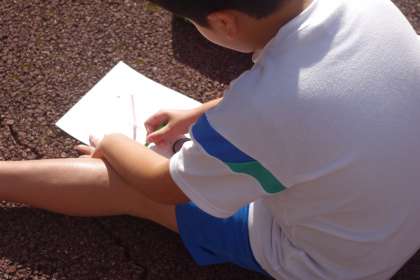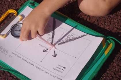 影のでき方を確かめています。方位磁針で、方角をしっかり確認しています。