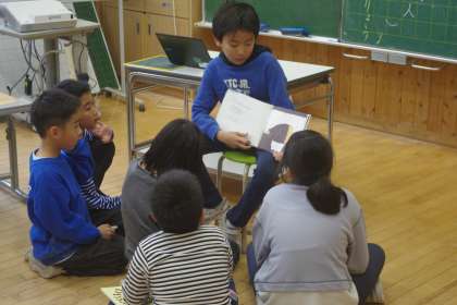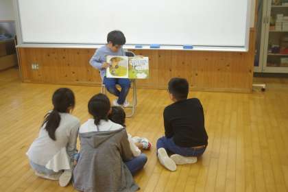 ハッピータイムに、スマイル班の読み聞かせを行いました。読み手がおすすめする本を班のみんなに読み聞かせます。読み手の子供たちは、とても上手に読んでいました。聞いている子供たちも楽しんでいました。