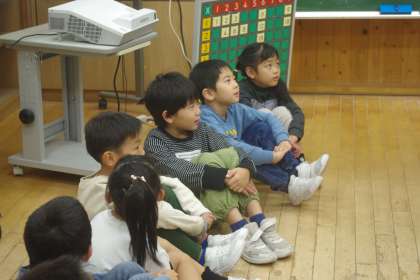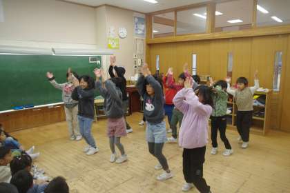 2,3年生が、今日の得意技紹介で発表するダンスを1年生に見せていました。1年生の子供たちは、楽しそうに観ています。