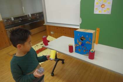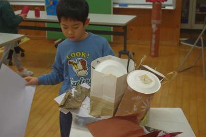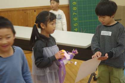 1年生が、生活科ルームで「あきのわくわくまつり」の準備をしています。場所を決めて、看板を設置したり、飾り付けをしたりする姿から、「自分たちの作ったおもちゃで楽しんでもらいたいな」と、わくわくしている気持ちが伝わってきます。