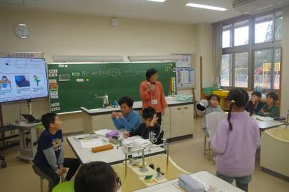 「空気はあたためるとどのようになるのかな」実験の結果をもとに話し合っています。