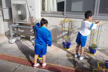これまで育ててきたアサガオの蔓を使ってリースを作るようです。大きく育ったので、しっかりとした蔓になりました。