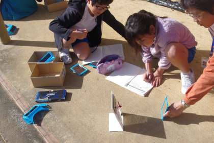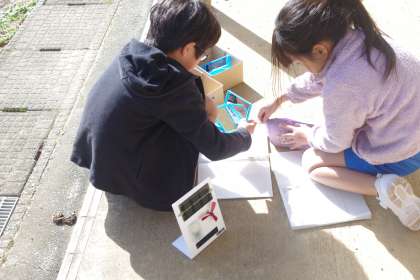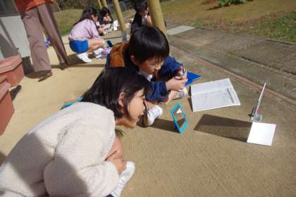 鏡で反射させた光を光電池に当てています。光が当たるとモーターが動くことに驚く子供たちです。