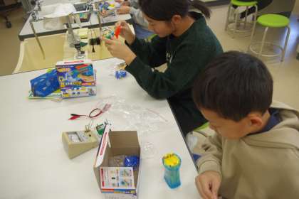手回しの発電機を作っています。これから、いろいろな実験が始まります。