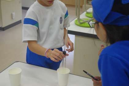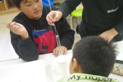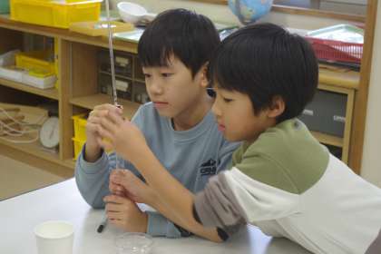 試験管を温かいお湯に入れたり、氷水に入れたりすると、ガラス管の中の水が、上下に動きます。試験管の中では、一体どんなことが起きているのか。子供たちは、いろいろ考えていました。