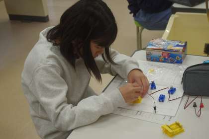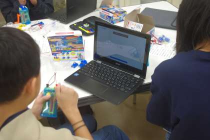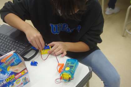 手回し発電機で起こした電流をコンデンサにためて実験しています。