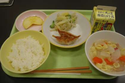 今日の献立は、山田のご飯、えごま餃子、マコモダケとえごま油のサラダ、コンソメスープ、山田のリンゴ飴、牛乳です。